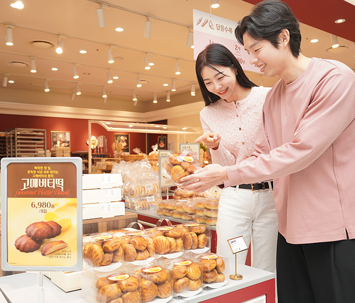 [사진 설명] 지난 1일 서울 용산구 이마트 용산점 내 베이커리 매장 ‘블랑제리’를 찾은 고객들이 신세계푸드가 출시한 ‘고메 버터떡’을 구입하고 있다. ‘고메 버터떡’은 프랑스산 고메버터를 사용해 깊은 버터의 풍미를 느낄 수 있으며, 겉은 ‘빠작’하고 속은 쫀득한 식감이 특징이다. 가격은 8입 기준으로 6980원으로 합리적이다. / 신세계푸드 제공